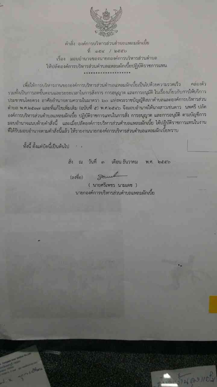 การมอบอำนาจของนายกองค์การบริหารส่วนตำบลแหลมผักเบี้ย ให้แก่ ปลัดองค์การบริหารส่วนตำบลแหลมผักเบี้ย